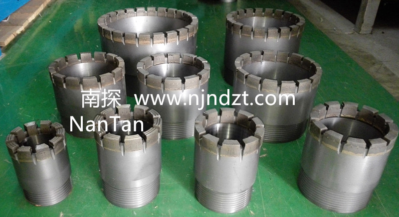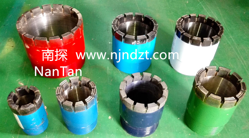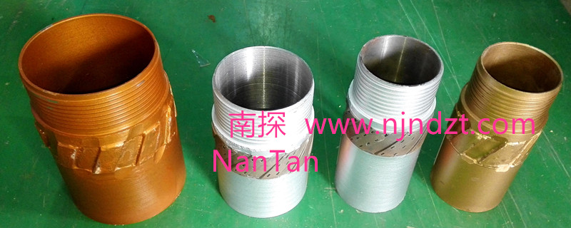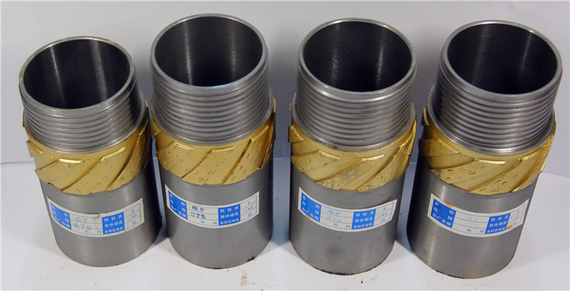 擴(kuò)孔器:連接在金剛石鉆頭與巖心管之間,起到擴(kuò)大孔徑和修整孔壁保證孔徑不縮小的一種鉆具。由于金剛石鉆頭直徑與巖心管外徑的尺寸相差很小,使孔壁與巖心管之間的間隙更加縮小,使過水受阻,并易造成卡鉆。金剛石擴(kuò)孔器是一短柱狀管體,上下鋼體部分有絲扣分別與鉆頭和巖心管相連,中間部分是覆蓋含金剛石的胎體,其外徑略大于金剛石鉆頭直徑(2毫米左右),胎體側(cè)表面上有過水水槽,使水流通過。在極堅硬易磨性的巖層,也有使用兩個和多個擴(kuò)孔器,除一個裝在鉆頭的上部以外,其余的間隔地裝在巖心管之間。