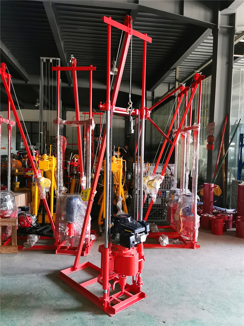 1、取樣鉆機:含汽油發(fā)動機、鉆進裝置、鏈條式支架、轉向盤、木架底座。